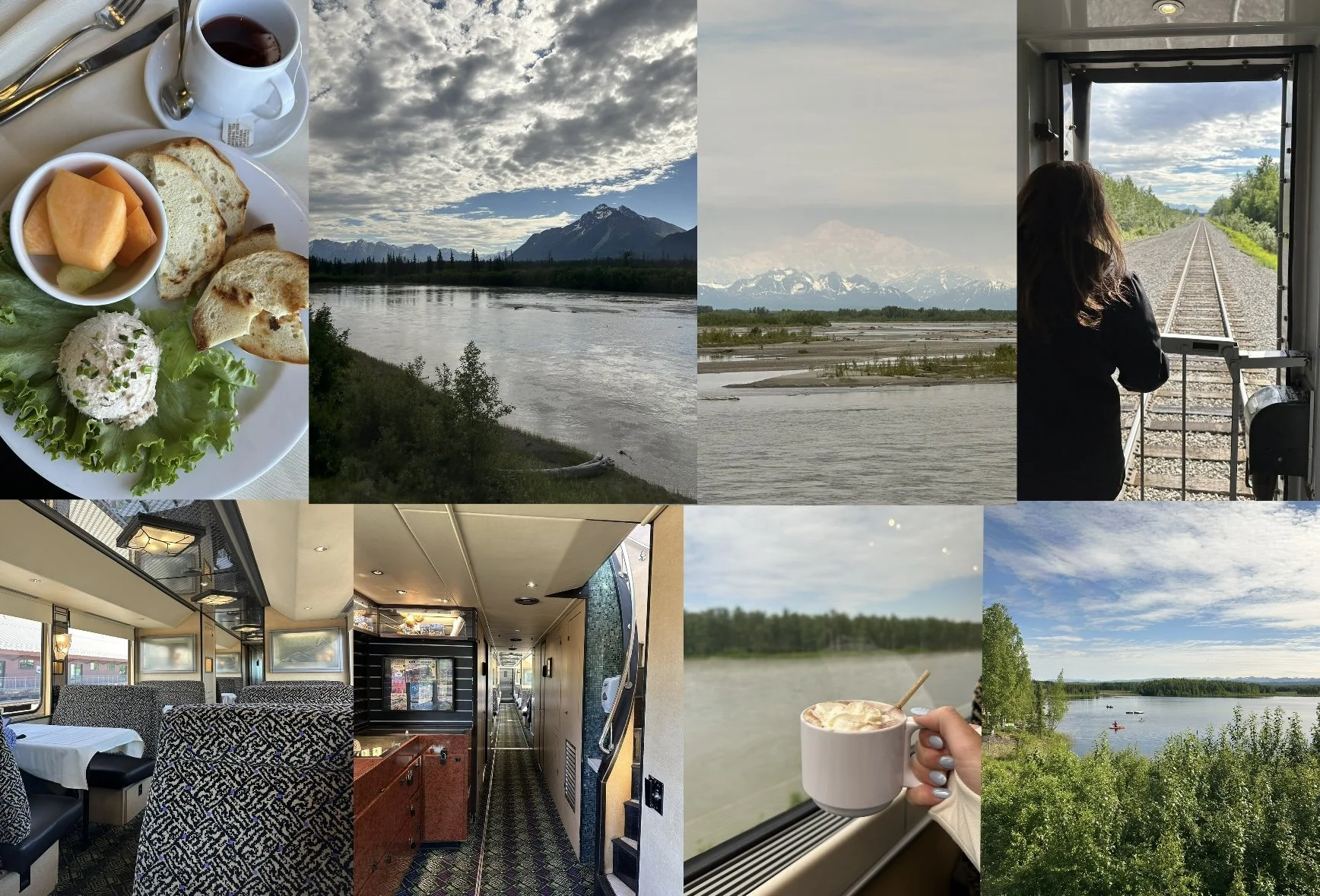 This was one of my favorite days of the trip, if not my top favorite. We took the McKinley Explorer dome train (exclusive for Holland America) from Anchorage to Denali National Park. There were also a few train cars for the Princess Cruises passengers — their hotel was right near ours in Denali. This was a full day excursion, from around 9am-5pm. Everyone sat upstairs, while the dining/bathrooms/outside areas were downstairs. I LOVED being able to stand outside, esp. at the back of the train! Luckily our train car was closer to the end too, so we didn’t need to cut through so many cars to get to the back. They served breakfast, lunch, snacks, and drinks (all extra $, not included in cost of tickets). For breakfast, I got the fisherman’s spread, which had Alaska smoked salmon, then got the bison chili and chips & salsa for a snack. Later on I also got the spiked hot chocolate. Once we arrived, charter buses took us on a quick ride to the hotel (McKinley Chalet, owned by Holland America).